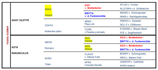 W czteropokoleniowym rodowodzie Faski występuje dwóch wspólnych przodków, obecnych zarówno po stronie ojca jak i matki. Są nimi Ago v. Bretterkeller i Britta v.d. Funkenmühle, czyli rodzice trójki rodzeństwa Arko, Ago i Aida z miotu „A Heland”, pierwszego miotu hovawartów urodzonego w Polsce. Odnotować należy, że w IV pokoleniu widnieje imię także czwartej z rodzeństwa Heland, czyli Aury, ale tę sukę pomijamy w obliczeniach, ponieważ prezentowany rodowód nie obejmuje informacji o jej rodzicach.