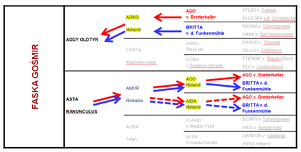 W obliczeniach współczynnika F należy uwzględnić następujące ścieżki, prowadzące od wspólnych przodków: psa Ago (czerwony kolor) i suki Britta (niebieski kolor), poprzez psa Arko Heland ze strony ojca Faski oraz psy Ago i Aida Heland ze strony matki Faski.