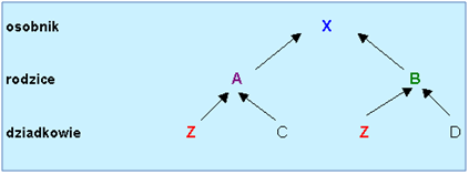 W podanym powyżej liczba pokoleń dzielących rodziców osobnika X od przodka Z wynosi: 1 dla matki A i 1 dla ojca B. Tym samym współczynnik inbredu osobnika X wynosi: